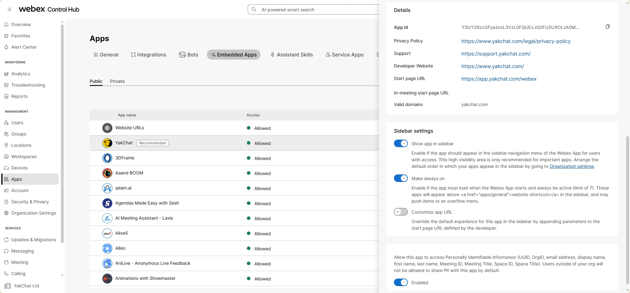 Important: For the YakChat embedded app to work as built, including displaying the messages notifications badge, the following settings must be enabled in Webex Control Hub by your organization's Webex Admin.