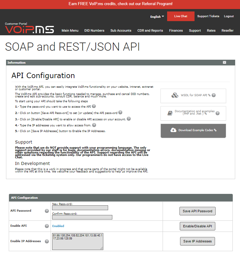 Your VoIP.ms API is enabled using your VoIP.ms portal.