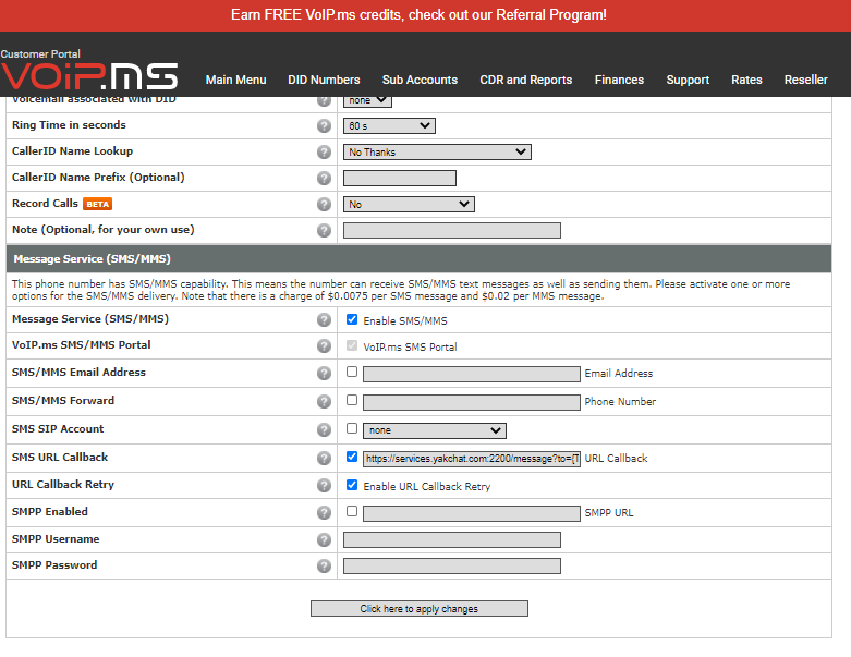 SMS URL Callback: Paste the following URL: https://api2.yakchat.com/voip/message?to={TO}&from={FROM}&message={MESSAGE}&id={ID}&date={TIMESTAMP}&media={MEDIA}