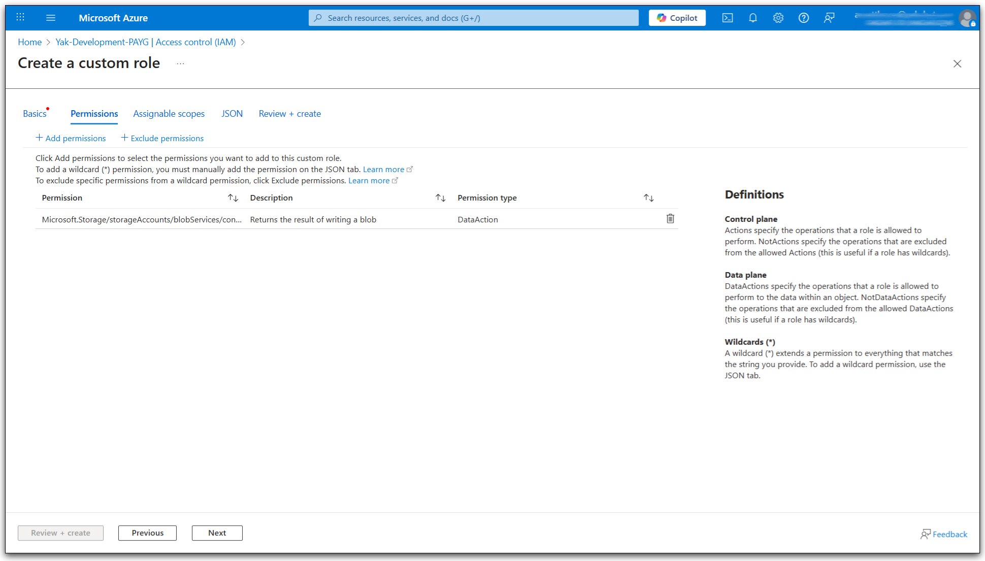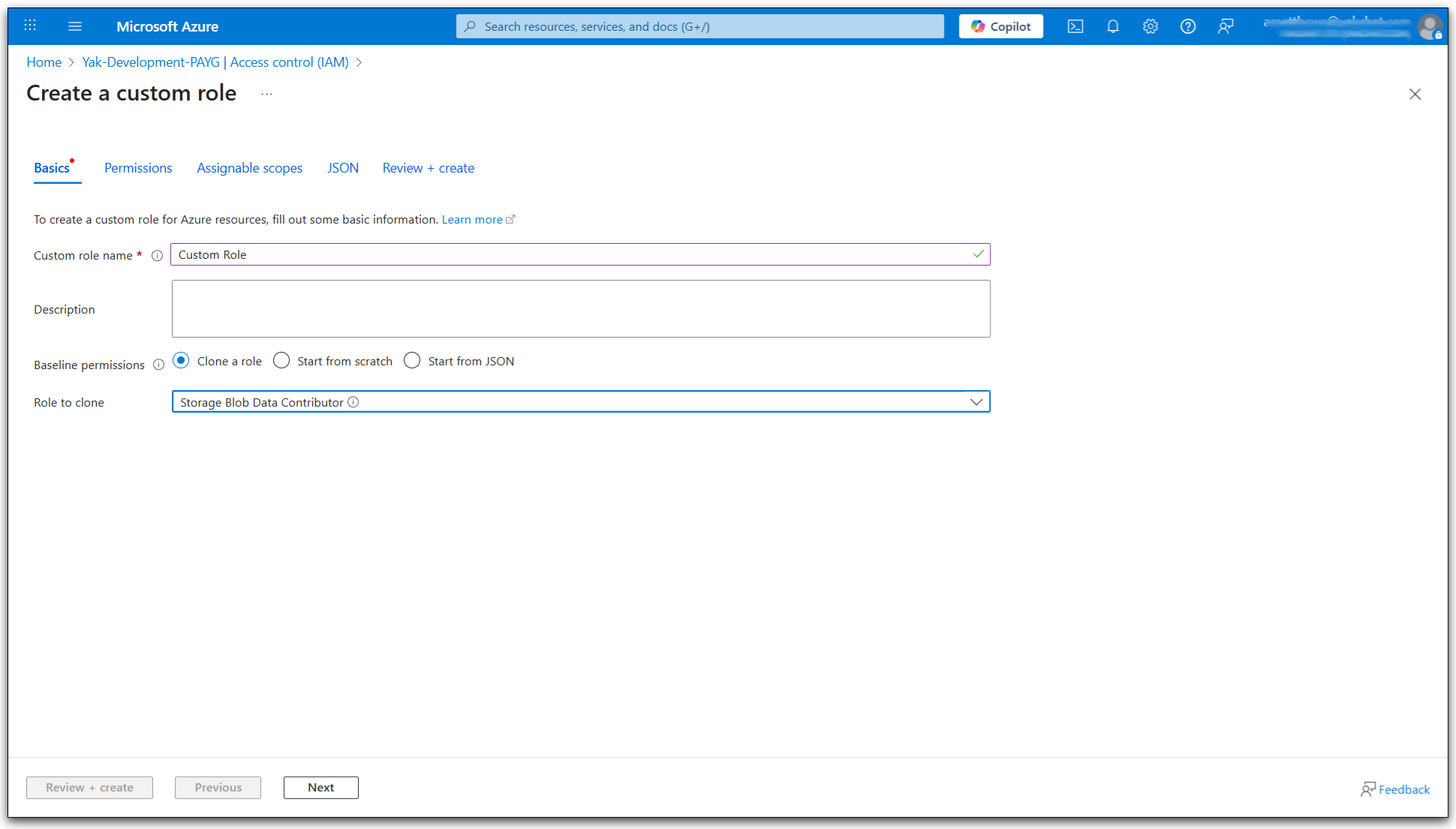 4. Enter a name for the role (make a note of this it will be used later), optionally enter a description, and select Clone a role as the Baseline permissions, selecting Storage Blob Data Contributor as the Role to clone and press Next.