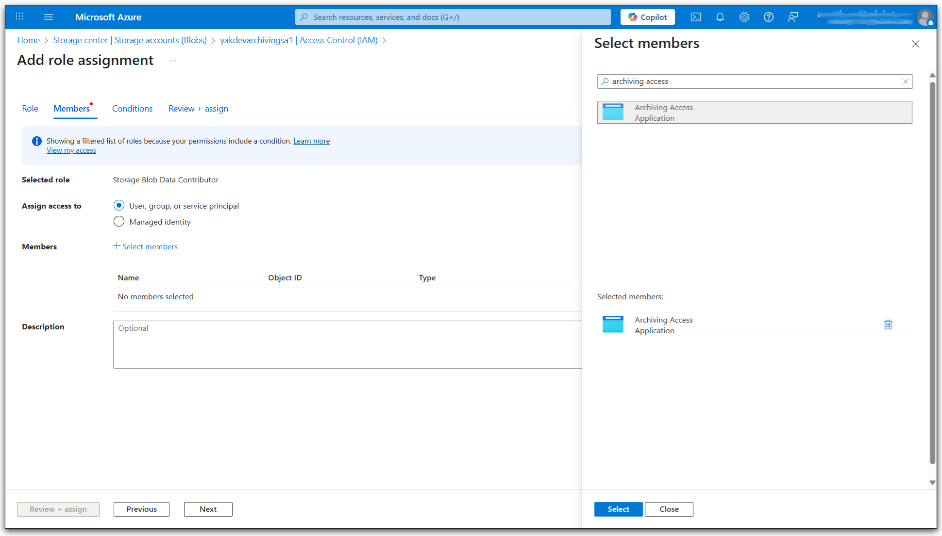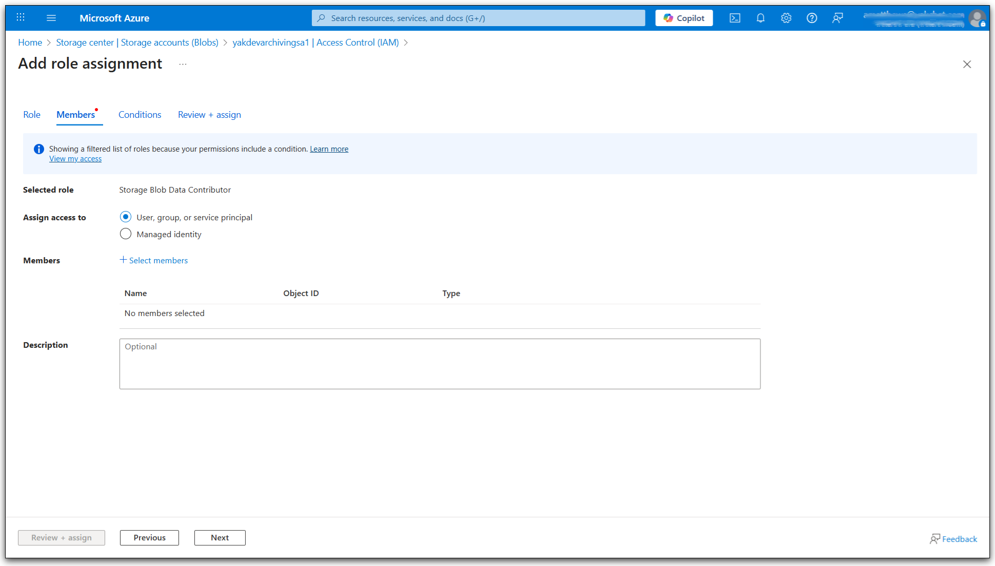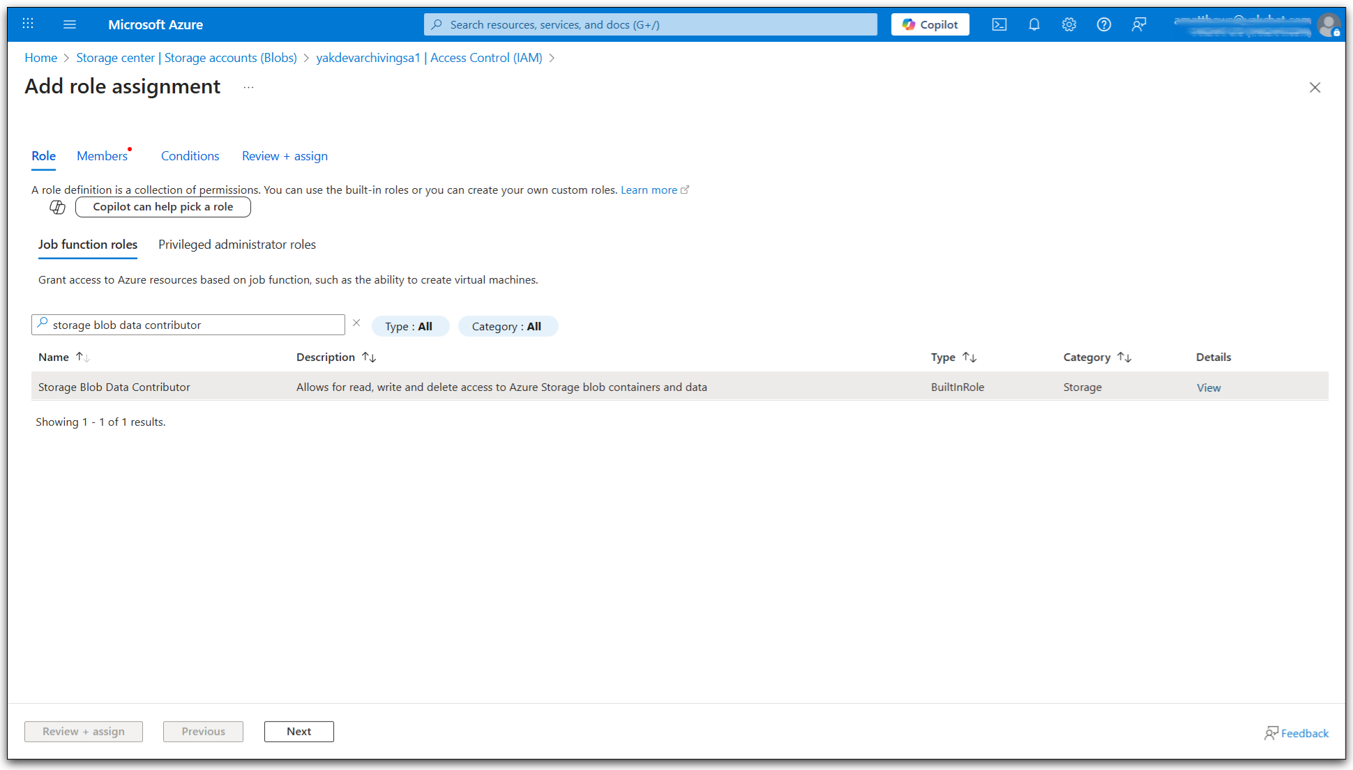 4. Select a Role, either the built in role Storage Blob Data Contributor or the Custom Role created in the previous optional step and press Next.