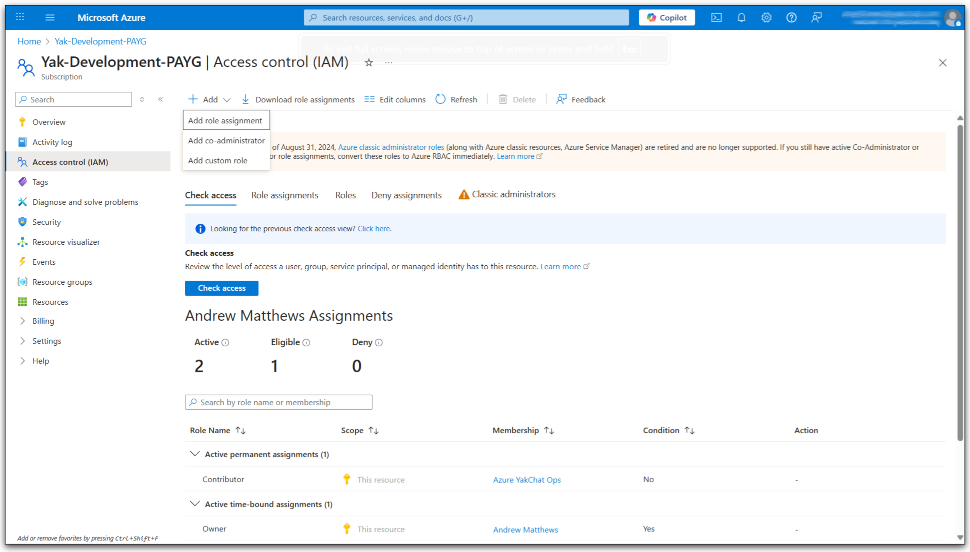 3. On the left hand menu, select Access Control (IAM) and then select Add > Add role assignment.