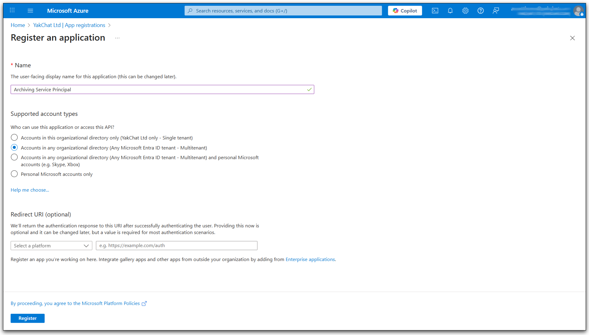 4. Enter a name for the registration (make a note of this it will be used later), select Accounts in any organizational directory (Any Microsoft Entra ID tenant - Multitenant) under Supported Account Types and press Register.