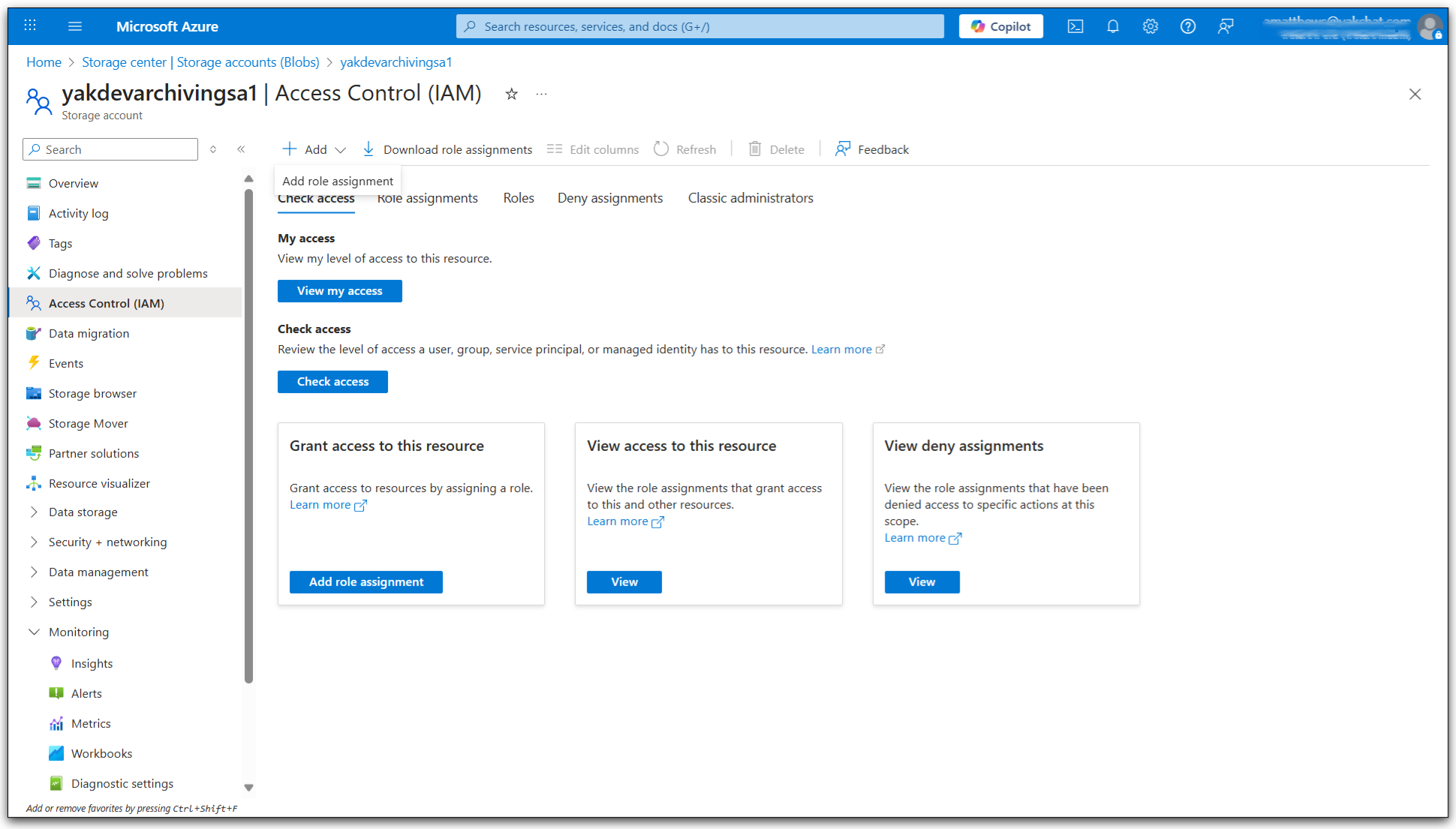 This method allows you to configure YakChat to deposit archived conversation data into your own Azure Storage Account. You will first need to create a Service Principal with a secret, optionally create a custom role, and then assign the Service Principal to the Storage Account.