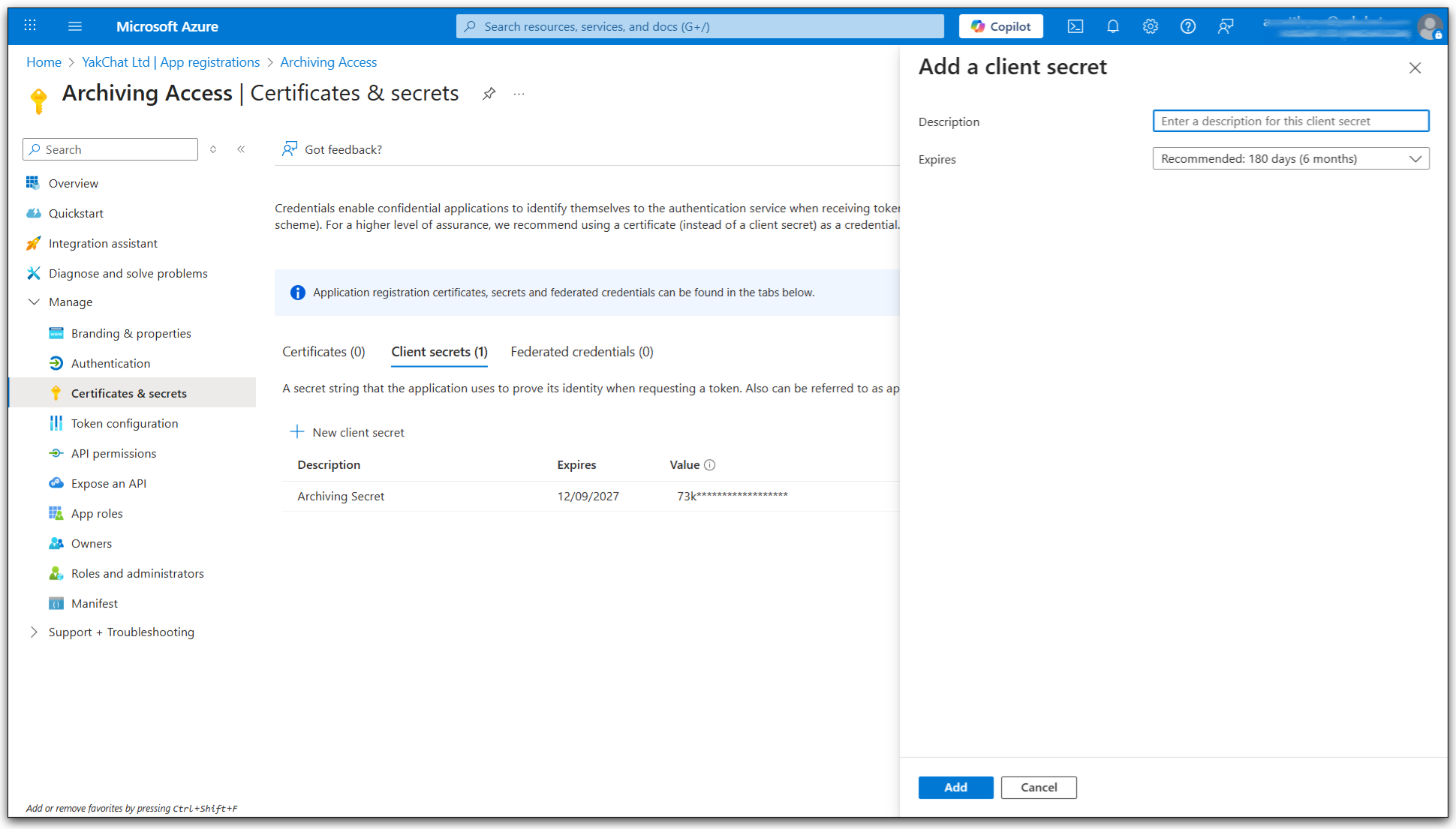 6. On the left hand menu, select Certificates & secrets under Manage and then select Client secrets and New client secret.