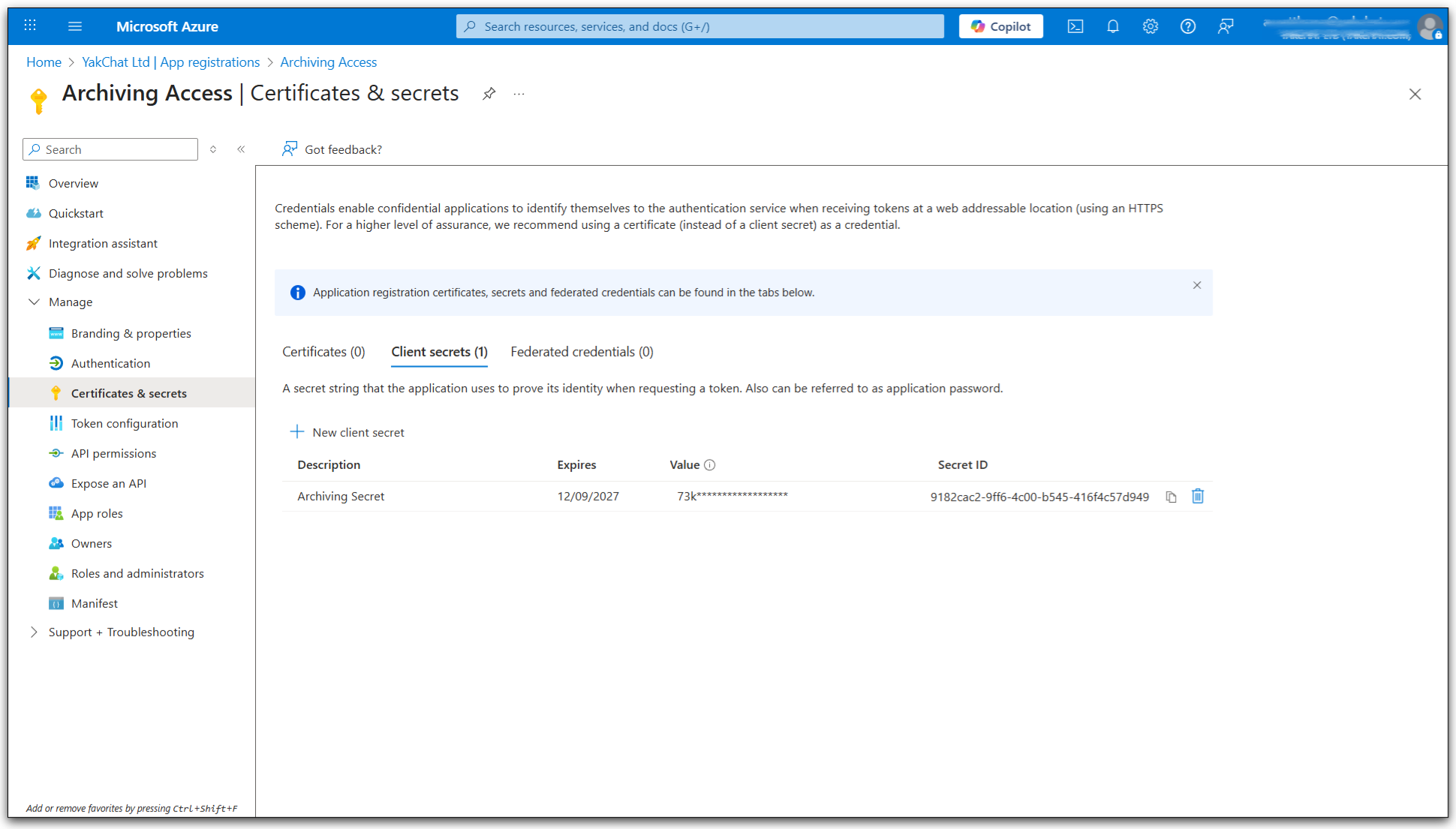 8. The newly created secret will be displayed in the Client secrets table, make a note of the Value column now as this will be used later and cannot be viewed again once you leave this screen.